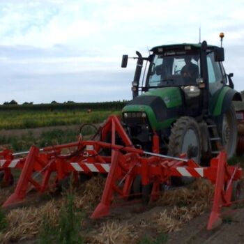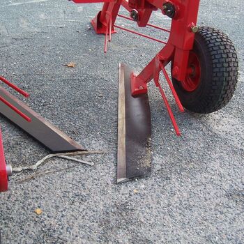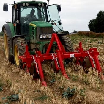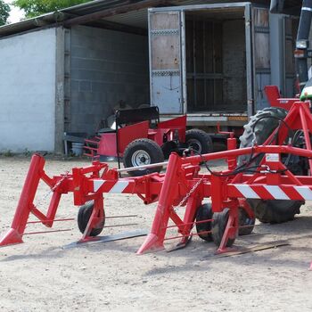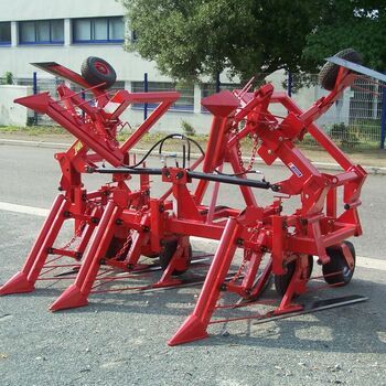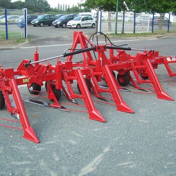 Front-mounted equipment with adjustable shares, retractors, and detachable cutting blades. Each pulling head is equipped with a 15x6.00-6 wheel, a retractor, and a treated steel liftable blade. The frame includes two adjustable gauge wheels (16x7.5-8).